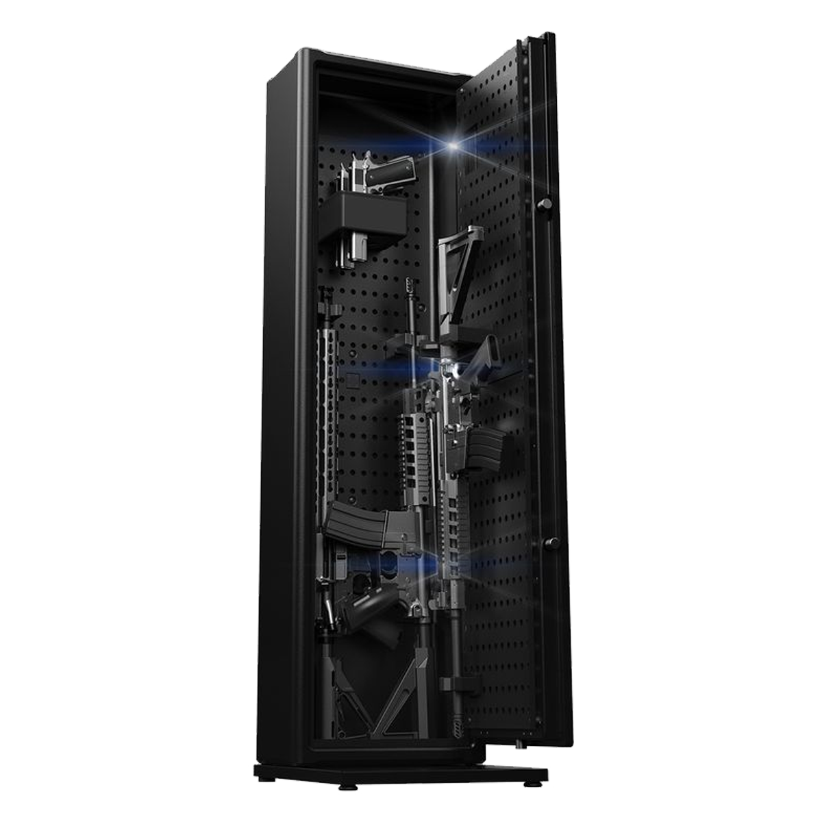 The Vaultek RS500i Plus is a high-capacity biometric rifle safe designed for quick access and secure storage. It features a 14-gauge carbon steel construction with four solid steel locking bolts, anti-pry bars, and ruggedized interior hinges for enhanced security. The safe offers multiple access points, including a 20% oversized Smart Align™ biometric scanner capable of storing up to 80 fingerprints, a backlit 8-digit Smart Sense™ keypad, a Nano Key™, and manual keys. The interior is modular, capable of storing up to 5 rifles and multiple handguns, with perforated mounting boards for customization. Additionally, the safe is equipped with interior LED lighting that automatically illuminates when the door opens. It also features Wi-Fi connectivity via Vaultek's ViSN™ platform, allowing for real-time monitoring and alerts through a smartphone app. The RS500i Plus includes accessories such as a universal twin holster, barrel mounts with adapters, and mounting hardware. It operates on a rechargeable lithium-ion battery with a six-month lifespan under normal use.